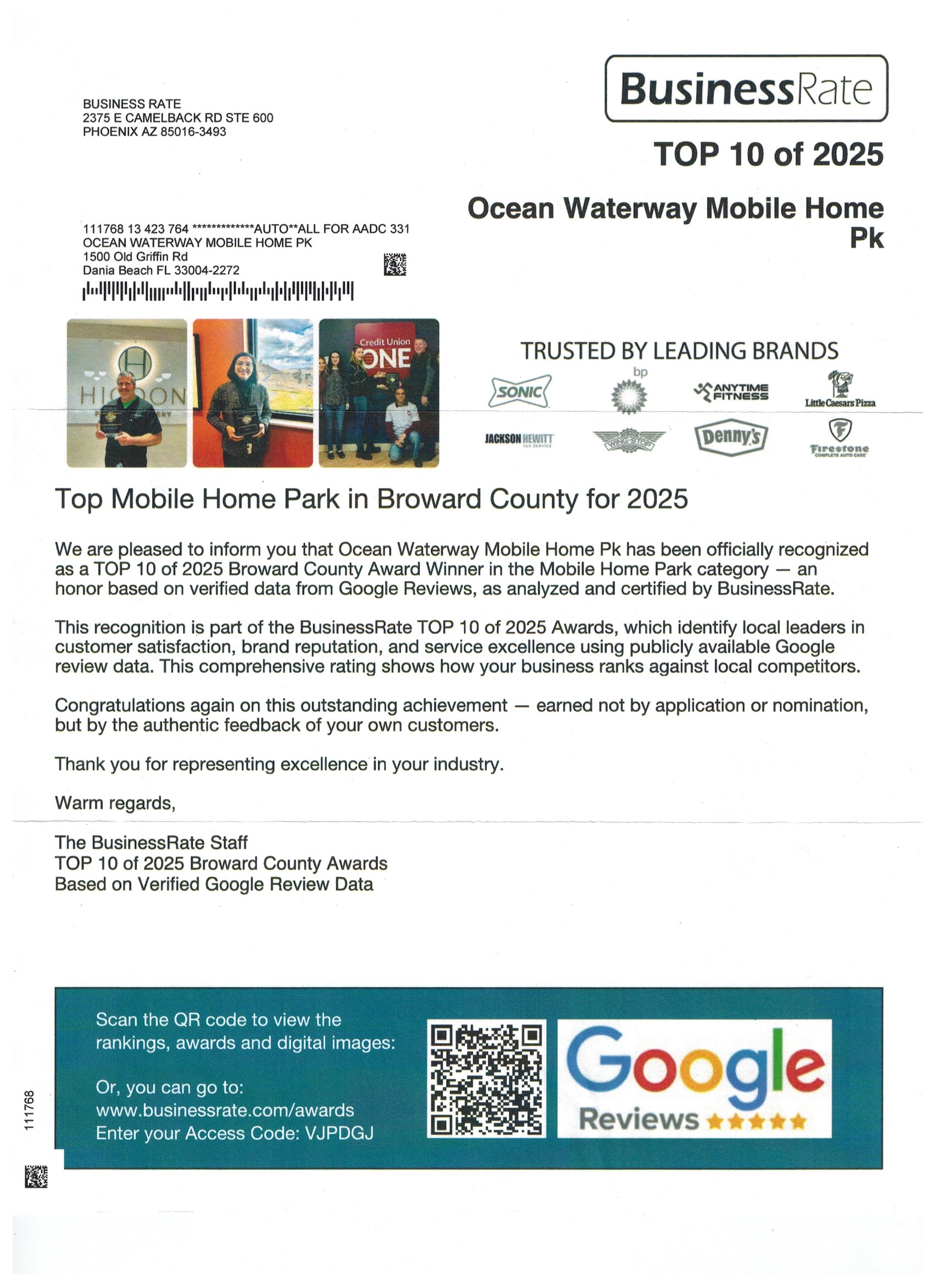 For a second year, Ocean Waterway Mobile Home Park has been acclaimed as one of the best mobile home parks in the Fort Lauderdale area.